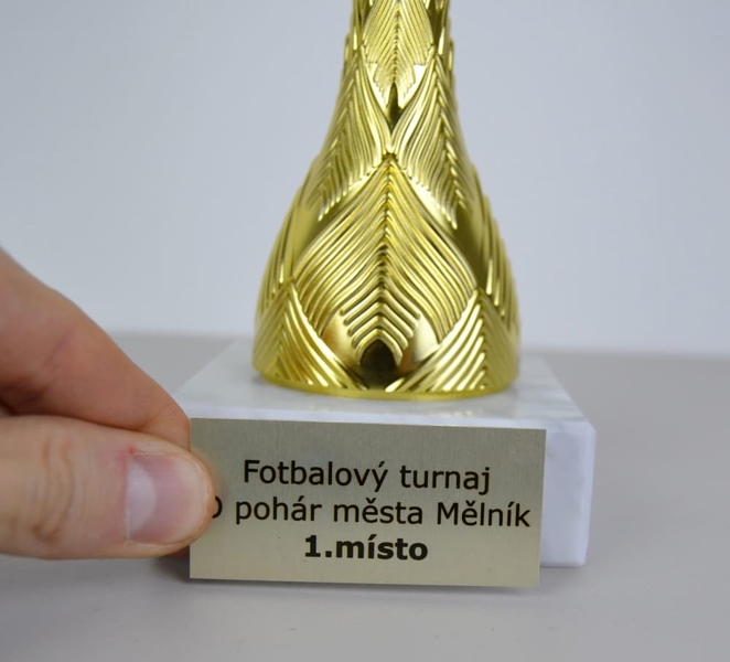 Na podstavec je možné umístit štítek s textem či obrázkem. Štítek není zahrnut v ceně poháru a je nutné ho dodatečně zakoupit viz. DOPLŇKOVÉ PRODUKTY